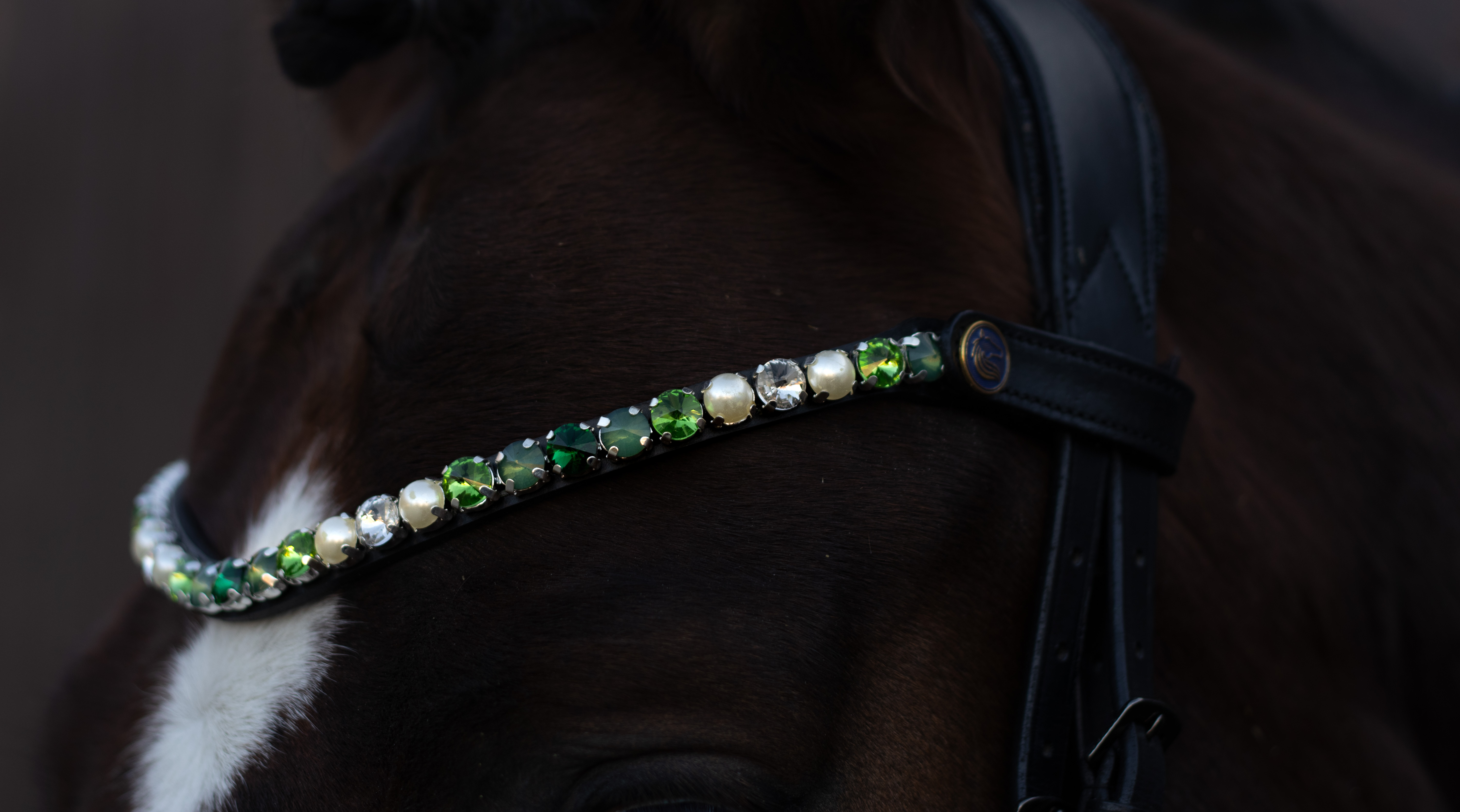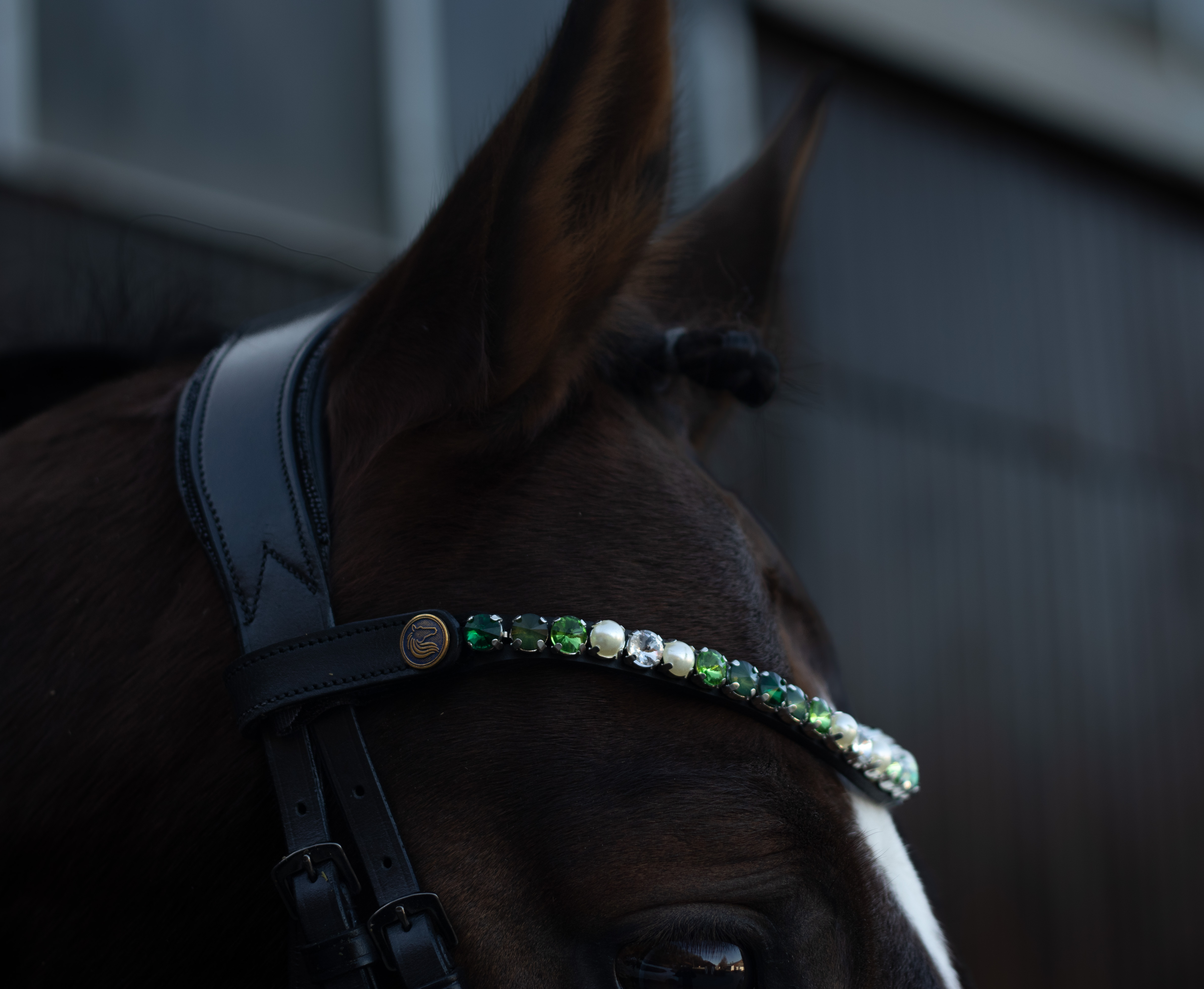 Der Stirnriemen Forest Light verbindet erdige Grüntöne mit sanftem Glanz – inspiriert vom Lichtspiel des Waldes. Die edlen STELLUX™-Steine in Smaragd, Oliv und Kristall verleihen diesem Stirnriemen eine elegante, harmonische Ausstrahlung, die jedem Pferd Charakter verleiht.