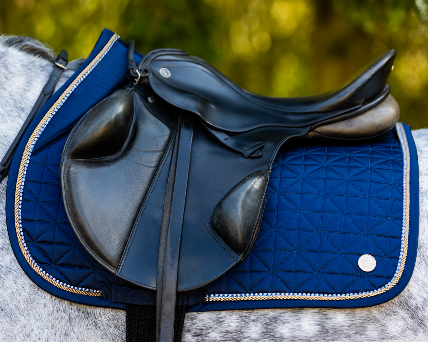 Die "Prince Blue" Schabracke vereint handwerkliche Raffinesse und Inspiration von Luxusmarken. Ihre besondere Steppung erinnert an die Eleganz und Qualität, die man von Luxusprodukten kennt. Jede Schabracke wurde sorgfältig gefertigt, um höchsten Ansprüchen gerecht zu werden. Dein Pferd verdient das Beste, und diese Schabracke liefert genau das.