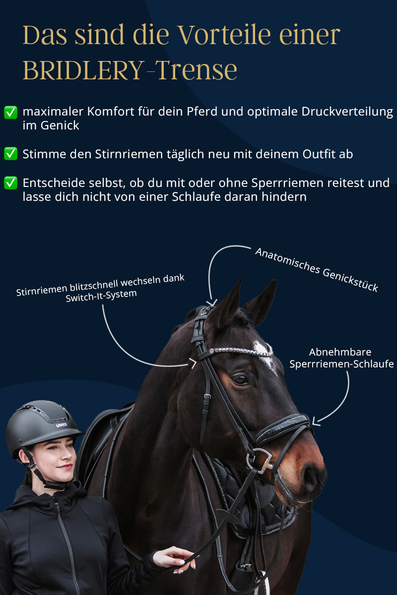 Wer kennt es nicht - das lästige Auseinanderbauen der Trense, wenn man mal einen neuen, schicken Stirnriemen verwenden möchte. Das gehört dank unserem Switch-It-System der Vergangenheit an. Wickel dafür zunächst das Klettband fest um das Genickstück herum. Anschließend musst du nur noch den Druckknopf schließen. Noch nie war das Stirnriemen wechseln so einfach, daher kannst du problemlos jeden Tag deinen Stirnriemen an dein Outfit anpassen ?