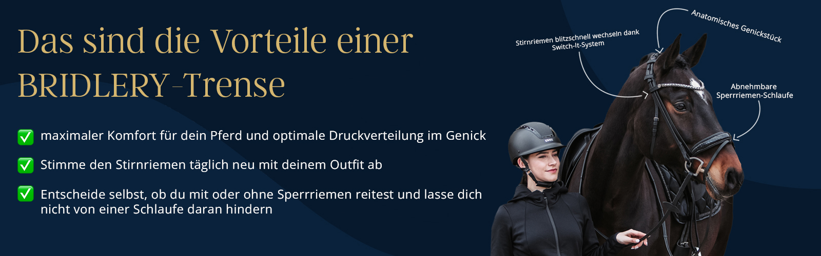 Hattest du schon mal einen zu engen Helm oder eine zu enge Brille an? Es drückt, man bekommt Kopfschmerzen und insgesamt ist das kein angenehmes Gefühl. Genau so muss sich ein Pferd mit einem drückenden Genickstück fühlen. Viele Genickstücke haben heutzutage immer noch keine anatomische Form und sind stattdessen gerade geschnitten oder die Ohrenausschnitte eines vermeintlich anatomischen Genickstücks sind zu klein, so dass diese erst recht in die Ohrmuscheln des Pferdes reindrücken. Bei uns hast du nicht nur möglichst große Ohrenausschnitte, sondern auch die Möglichkeit der Nackenfreiheit. Dabei spart unsere superweiche Polsterung das Nackenband aus und verteilt somit vom Nackenband auf die seitliche Halsmuskulatur um. Besonders gut für Pferde, die im Bereich des Nackenbands und Atlaswirbel empfindlich sind. Und damit du sichergehen kannst, dass die Ohrenausschnitte deiner Trense groß genug sind, haben wir die Passform-Garantie: Sollte dein Genickstück nicht passen, kannst du es problemlos gegen ein Genickstück in einer anderen Größe umtauschen.